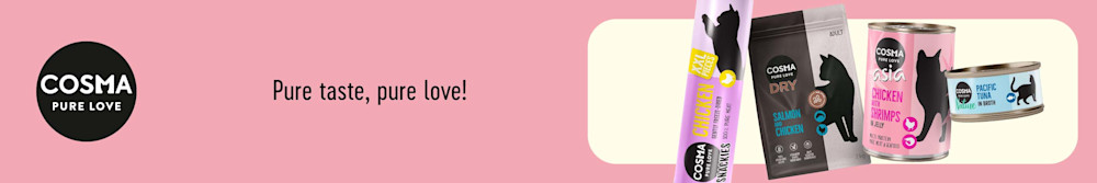 Cosma premium wet cat food is made from pure meat or fish. It provides your cat with a balanced, wholesome meal. It is species-appropriate and a pure delight for your cat. Choose from Cosma Original, made with 100% meat or fish, Cosma Asia, made with a touch of rice for a taste of the exotic, and Cosma Soups, the tasty way to up your cat's liquid intake. Cosma cat foods are pure indulgence for your cat.