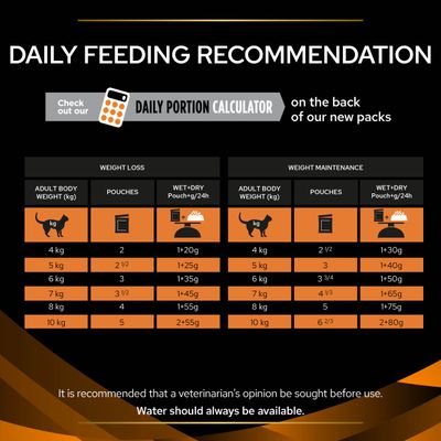 | Adult Cat's Weight | Number of Pouches | Wet + Dry (pouch + g/24h) |