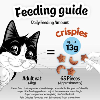 - Crispies Salmon & Trout: For an average adult cat (4kg), feed up to 13g (approx. 65 pieces) per day.
