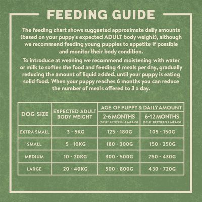 The recommended daily servings shown in the chart are a guide only. How much you feed depends on age, breed and level of activity and you should use your own judgement to determine the correct amount of food needed for your dog. For active dogs add 10% more food. Young and growing dogs require feeding little and often and to appetite. Always make sure that your dog has access to fresh water at all times. When changing dog foods, we recommend that you do so gradually. Store in a cool, dry place and fold down the top of the bag after opening.
